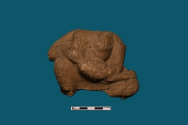 | Description / विवरण | A terracotta figurine portrays a scene of a mother and child, despite being broken. The mother is depicted in a seated position, with the child on her lap being breastfed. Partially visible hands add to the depiction. |