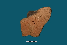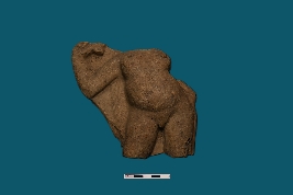 | Description / विवरण | A broken terracotta plaque displays a male bust intact from neck to thigh. While the left hand is missing, the right hand is bent upwards. The private part is visible in the depiction. |