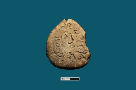 | Description / विवरण | A terracotta seal bearing a three line inscription in proto Bengali script. Terracotta seal bearing a rectangle on the reverse side. The object is almost triangular-shaped. |