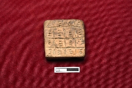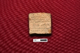 | Description / विवरण | A terracotta square seal, bearing 16 divisions with straight lines on the obverse, each division containing three symbols resembling semi-hemispherical shapes, all facing the same direction. The reverse side is divided into sixteen parts, with each part containing three dashes aligned vertically. |