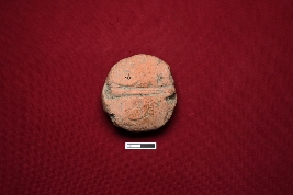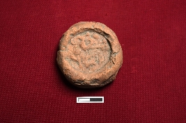 | Description / विवरण | A terracotta circular seal, depicting three arched hills at the bottom right, possibly a peacock atop and Indrdhavja beside it. The rest of the seal is unidentifiable. nothing is visible on the reverse side. |