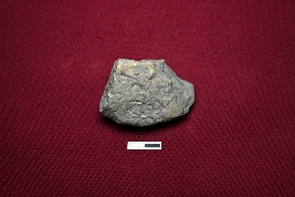 | Description / विवरण | A terracotta seal bearing several unidentified depictions, with four circles on the reverse side. The object appears to be broken. |