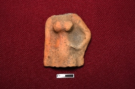 | Description / विवरण | This terracotta plaque features an intact female figurine from neck to thigh, with visible breasts. The left hand rests on the left waist, while the right one is broken and appears straight in nature. The waist is narrow. |