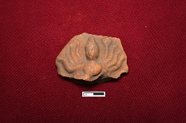 | Description / विवरण | A terracotta plaque depicts a female figurine intact from the top to the upper belly. The figurine has eight hands, four on each side respectively, with a narrow waist. The face is not clearly visible. |