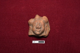 | Description / विवरण | A fragmented terracotta head of a human figurine. It has a headgear on the top of the head. The middle portion is conical, while the rest is rounded. Only the nose and lips are visible. |