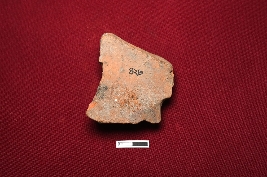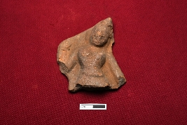 | Description / विवरण | A terracotta plaque showing a female figurine intact from top to belly. The left hand is broken from almost its half portion. The Right one is bent and moves upwards. Breasts are visible. A conical headgear is placed on top. |