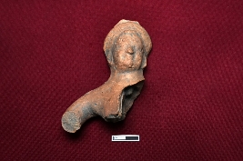 | Description / विवरण | A fragmented human figurine presents itself with a partly broken right hand. The nose and lips emerge from obscurity, adorned with a headband placed atop. |