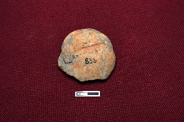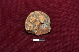 | Description / विवरण | Within a terracotta plaque lie decorative elements, its round shape featuring two swollen parts. The remainder remains unidentified due to damage |