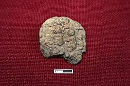 | Description / विवरण | A terracotta plaque depicts a social scene teeming with human figurines. Three figures grace the composition, seemingly seated upon an animal. The central figure, positioned frontally, assumes prominence, with an umbrella atop him. This umbrella finds support from a second person. Lastly, a small child figurine, adorned with threads on his shoulder. Intricate decorations adorn the entire plaque. |