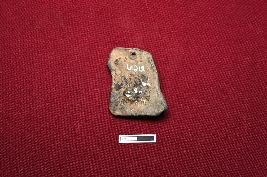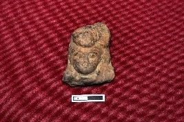 | Description / विवरण | A terracotta plaque presents the visage of a human figurine, crowned with a headgear atop. The face shines forth in its entirety, embellished with a large circular earring. A visible perforation adds to its allure. |