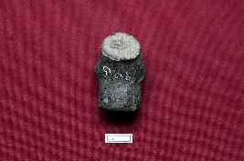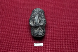 | Description / विवरण | A black terracotta doll, with a polished surface, captivates the eye with its circular eyes and owl-like appearance. The object, resembling an owl, stands upon a flattened base. |