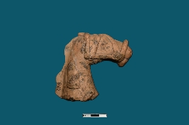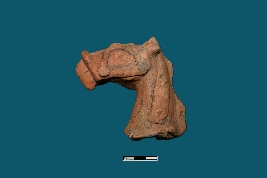 | Description / विवरण | The broken head of a horse figurine, with only the head portion visible. It is decorated with a bridle and has a red smooth surface. |