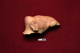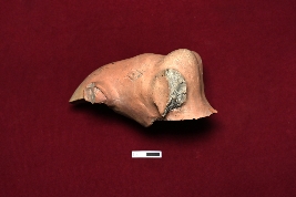| Description / विवरण | A broken terracotta elephant figurine, red in color with a smooth surface. Only the head portion is visible, with broken ears visible and the rest not visible. |