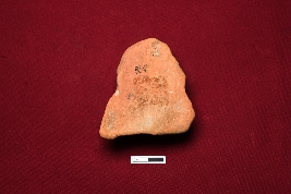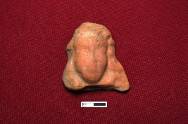 | Description / विवरण | A terracotta plaque displaying the head of a human. The eyes, nose, and lips are not visible, but curly hair can be seen on the left side of the head. |