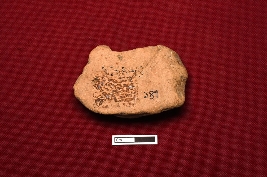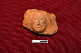 | Description / विवरण | A terracotta plaque displaying the head of a human. The eyes, nose, and lips are partly visible; the rest is not visible. |