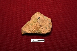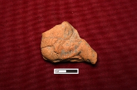 | Description / विवरण | A terracotta plaque showing a fragmented human figurine. Some portions of the legs are visible and adorned with folded decorated cloth. A knot of the cloth at the waist is also visible. |