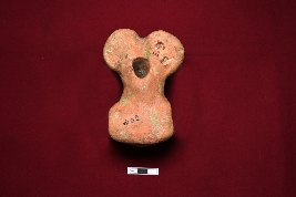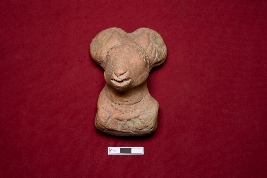 | Description / विवरण | The terracotta toy cart resembles a decorated animal figurine. The face is completely visible with eyes, nose, and mouth. The base of the figurine is partly decorated. Intricate decorations can be seen on the surface of the ear. A channel is placed at the bottom of the object to ensure the placement of the axle for holding wheels on both sides. There is a hole in the back of the figurine, probably used for hanging purposes. |