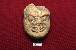 | Description / विवरण | This is a representation of a grotesque head with a rough surface and buff colour. It features large circular eyes, a thick nose, thick lips, and visible teeth. The purpose of this artifact remains unexplained. |