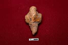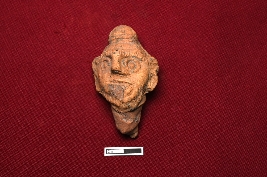 | Description / विवरण | This artifact represents a grotesque head with a smooth, red surface. It features large circular eyes, a thick nose with a broken mouth, thick eyebrows, and visible teeth. A large hair knot adorns the top of the head, and an extended neck is also visible. The purpose of this artifact remains unexplained. |