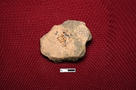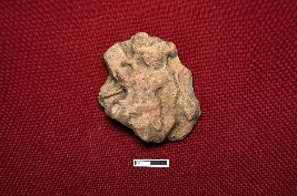 | Description / विवरण | A terracotta plaque shows a fragmented female figurine with visible headgear. Part of a waist belt is seen, and a knife-like object is placed to the right of the figurine. The rest of the figure is unidentified due to damage. |