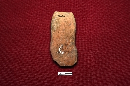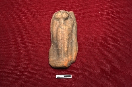 | Description / विवरण | A terracotta plaque displays a female figurine intact from the neck to the bottom. She has bulbous breasts that gradually narrow into the belly and widen at the waist. The left hand is placed on the waist, and the right hand is straight. The object stands on a pedestal-like base. |
