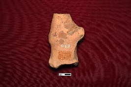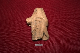 | Description / विवरण | A terracotta plaque displays the lower part of a human figurine with a narrow belly gradually widening into the waist. Only the legs are visible; the rest is broken. A channel is attached on the right side, though its purpose is unknown. |