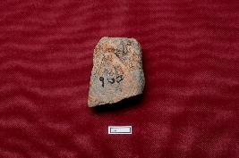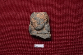 | Description / विवरण | The head of a human figurine with washed slip shows a face that is partly eroded, revealing the left eye, nose, and mouth. Two circular earrings can be seen. |