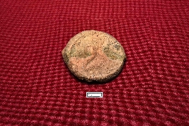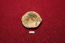 | Description / विवरण | This nearly circular terracotta seal displays some indistinct depictions on the obverse, while the reverse side features parallel lines. |