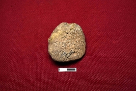 | Description / विवरण | A terracotta seal displays a three-line inscription in Proto-Bengali script on the obverse. The reverse side shows visible cracks. |