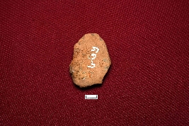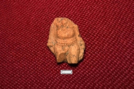 | Description / विवरण | A terracotta plaque shows a human figurine intact from neck to thigh. The figurine has a swollen belly and a two-tier waist brace adorned with a beaded design. Both hands are straight. |