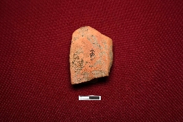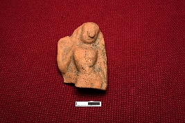 | Description / विवरण | A terracotta plaque shows a female figurine intact up to the knee. A swollen part is visible on the face. The breasts are completely visible, and the narrow waist gradually widens into the hips. Her left hand is straight, and the right hand is bent and raised upwards. |