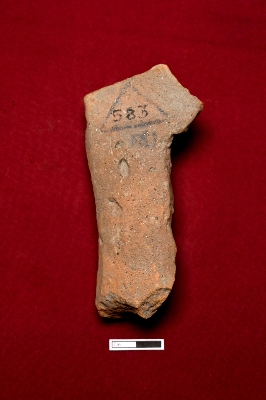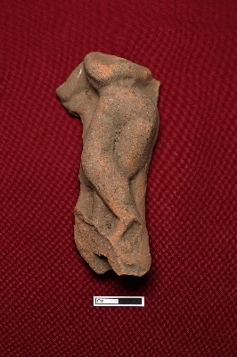 | Description / विवरण | This terracotta plaque depicts the lower part of a human figurine standing in a crossed-leg posture. It features a narrow belly gradually widening into the waist and hips, with the right hand partly visible. |