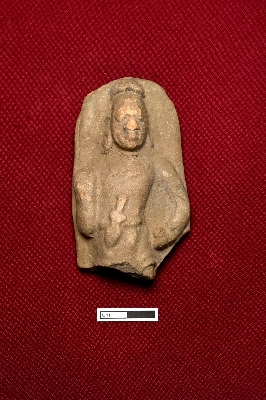 | Description / विवरण | This terracotta plaque displays a male figurine intact from the top to the thigh. It features a headgear, visible facial expressions, and a big circular earring on the right ear, with a partially visible earring on the left. The left hand is bent and placed on the waist, with a dagger tucked into the waist belt. |