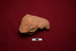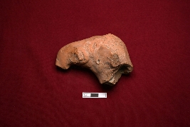 | Description / विवरण | A terracotta head of an elephant, with partly visible eyes and trunk; decorative features are visible on the surface. |