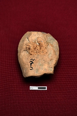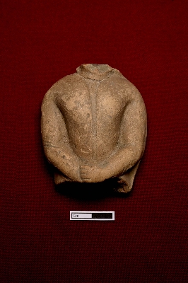 | Description / विवरण | A terracotta plaque shows a bust of a male figurine wearing a coat-like object. Both hands are clubbed in front of the waist. |