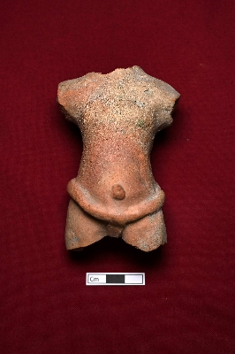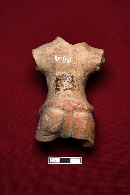 | Description / विवरण | A broken male figurine with smooth red surface. Only the bust is visible. A swollen object is attached near the navel. He is wearing a tiny loincloth to cover his private parts. |