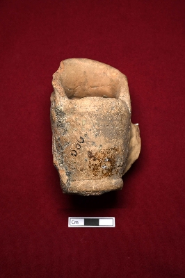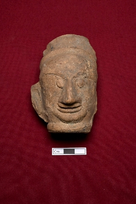 | Description / विवरण | A terracotta grotesque head in red with a smooth surface. The eyes are circular, with a sharp nose and broad lips. A small crown sits on top. Only the right ear is visible. The object is hollow. |