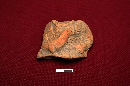 | Description / विवरण | A terracotta plaque depicting the bust of a male figurine. A bird is perched on his right hand, and his left hand is partly visible. He wears intricately designed clothing. |