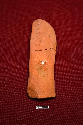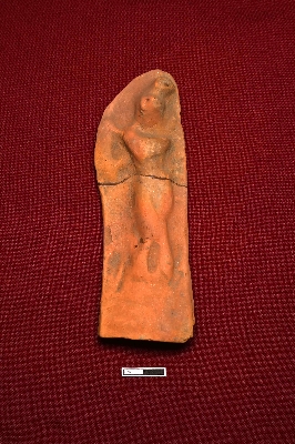 | Description / विवरण | This terracotta plaque depicts a female figurine with her head slightly bent to the left. The facial expression is obscured due to erosion and damage. |