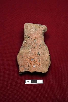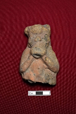 | Description / विवरण | A terracotta animal figurine displays the face of an unidentified animal. The details are difficult to discern due to damage. |