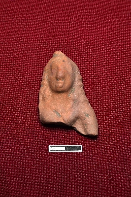 | Description / विवरण | A terracotta plaque displays a female figurine from the top to the upper part of the breast. Curly hair frames both sides of her face, and features include a sharp nose and thick lips. |