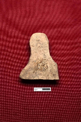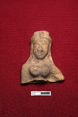 | Description / विवरण | This terracotta plaque shows a female figurine from the top to the upper part of the belly. The face is partly visible, with prominent breasts. |