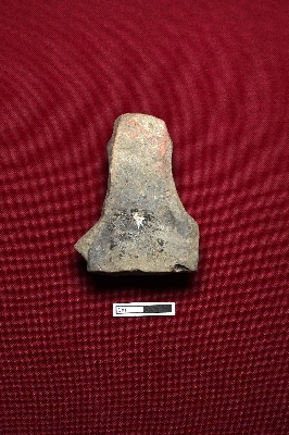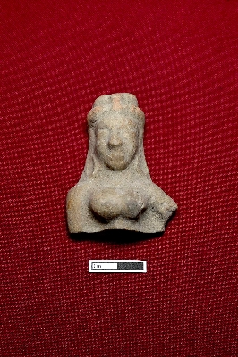 | Description / विवरण | A terracotta plaque shows a female figurine from the top to the lower part of the breast. Part of the facial expression is visible, with a rounded headgear on top. |