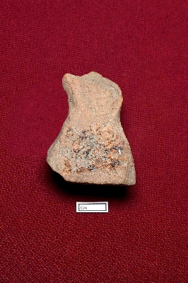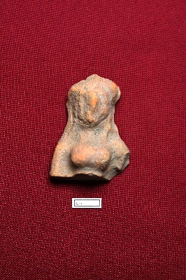 | Description / विवरण | A terracotta plaque shows a fragmented female figurine from the top to the lower part of the breast. The facial expression is not visible due to damage; only the breast is identifiable. |