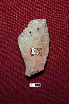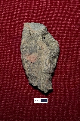 | Description / विवरण | A terracotta fragment depicting the lower part of a female figurine, with both hands partly visible and adorned with bangles. The lower section is decorated with folded and designed drapery. Two perforations suggest it may have been used for hanging. |