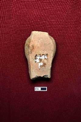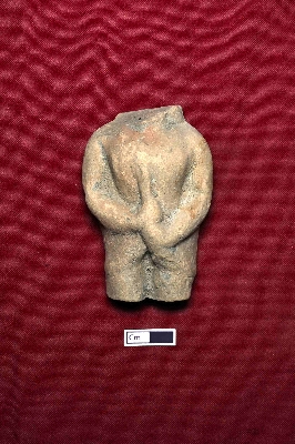 | Description / विवरण | A terracotta male figurine intact from the neck to the thigh. Both hands are positioned in front of the belly, holding an unidentified object. The rest of the figurine is broken. |