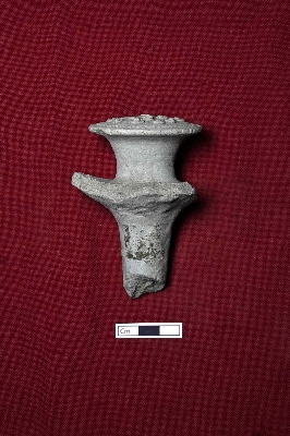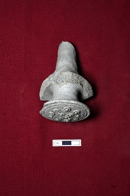 | Description / विवरण | A broken terracotta decorative piece featuring a circular lower part adorned with a design of dots and a thread motif across the circle. It could also serve as a seal, with a cylindrical part attached for handling. Another tilted circular part is attached in the middle of it. |