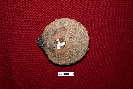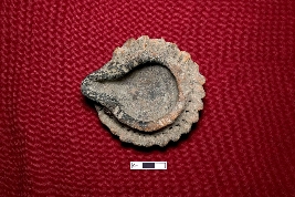 | Description / विवरण | A terracotta lamp, circular in shape, with an intact wick and a red-colored slip treatment. It has a straight, thick rim with a jagged design on the outer edge. The surface of the object is smooth. |