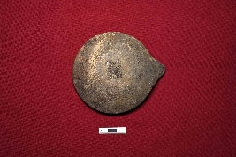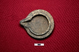 | Description / विवरण | A terracotta lamp featuring an intact wick and a red-colored slip treatment. It has a straight, thick rim and a smooth surface. |