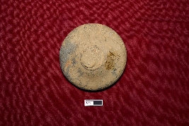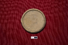 | Description / विवरण | A circular terracotta lamp with an intact wick and a red-colored slip treatment. The surface of the object is smooth. |